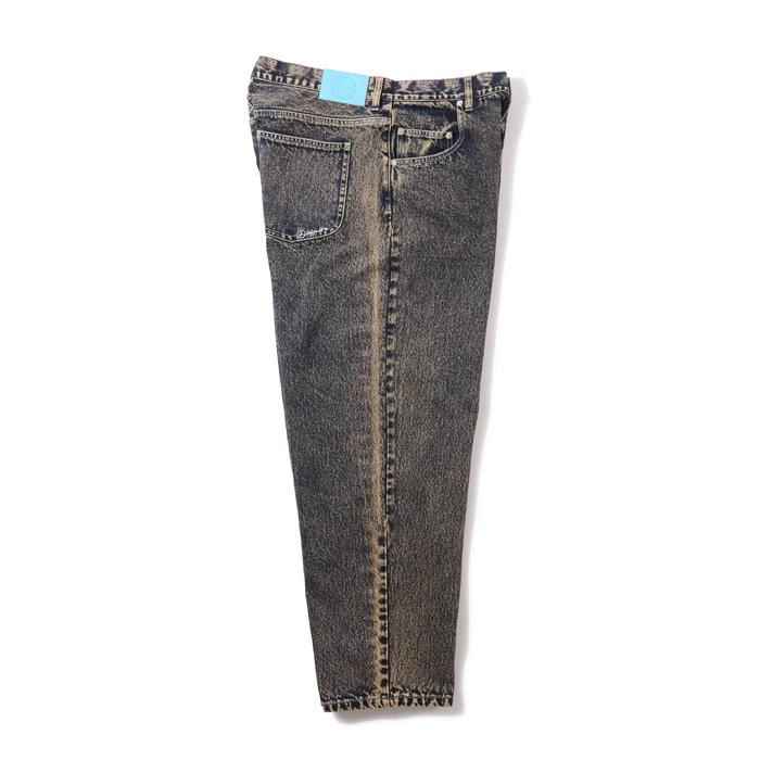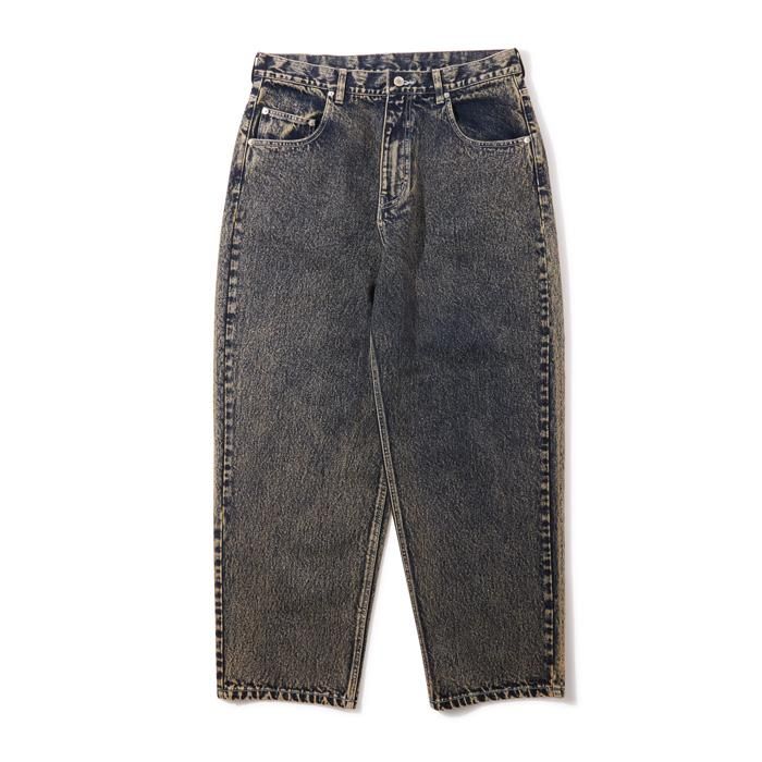 カラーデニムは製品にブリーチとケミカルウォッシュを施し、さらにオーバーダイ加工。