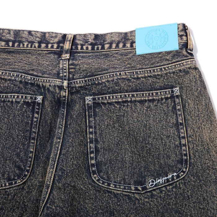 ワイドシルエットとのバランスが良い大きめのバックポケットにはステッチロゴ。