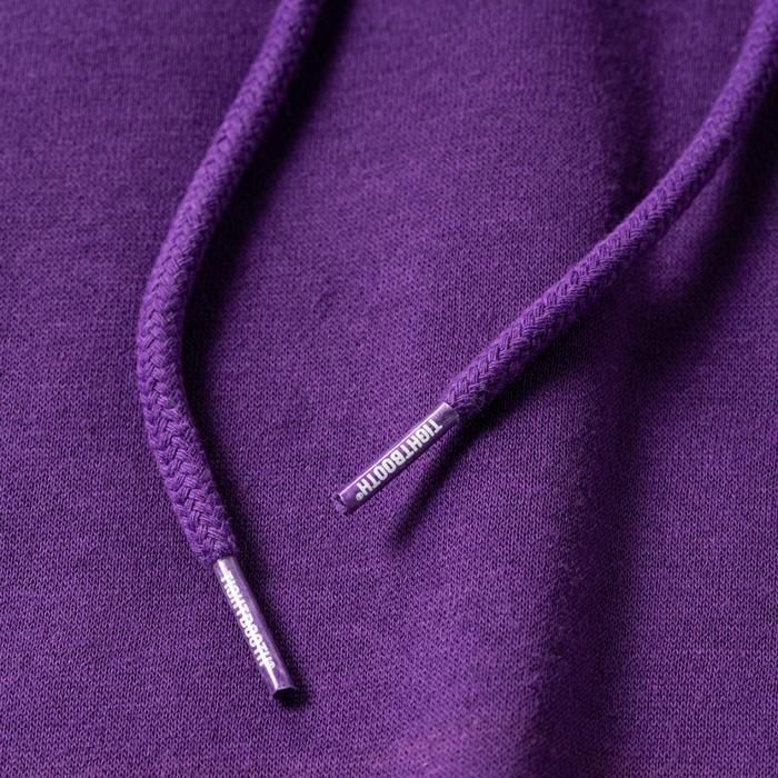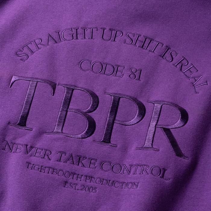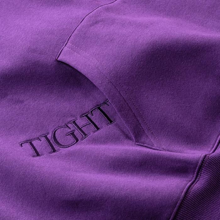前身頃のカンガルーポケットをくぐるようにTIGHTBOOTH PRODUCTIONの文字を曲線状に刺繍。