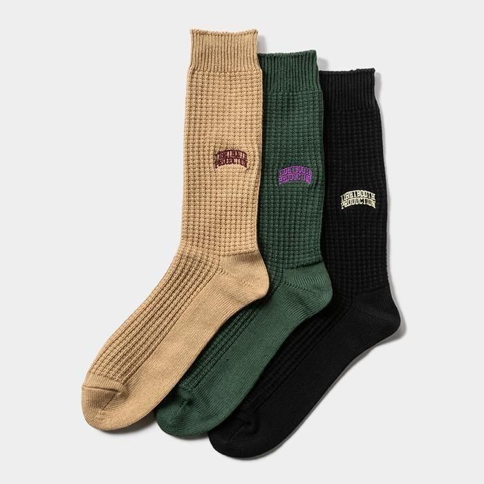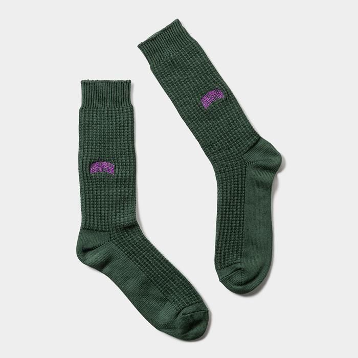 ローゲージの機械を使用し、太番手の綿糸でワッフル編みされたソックス。